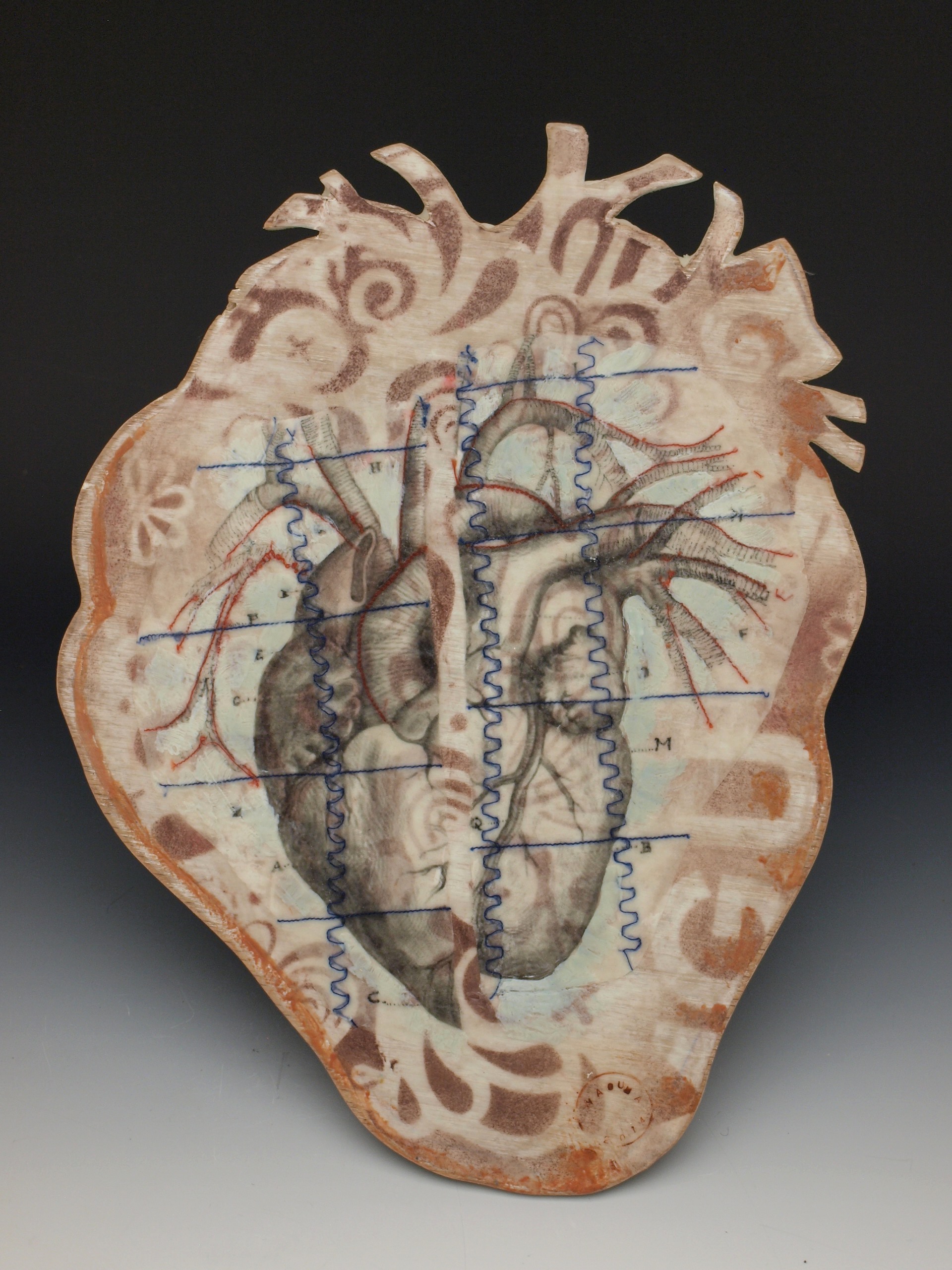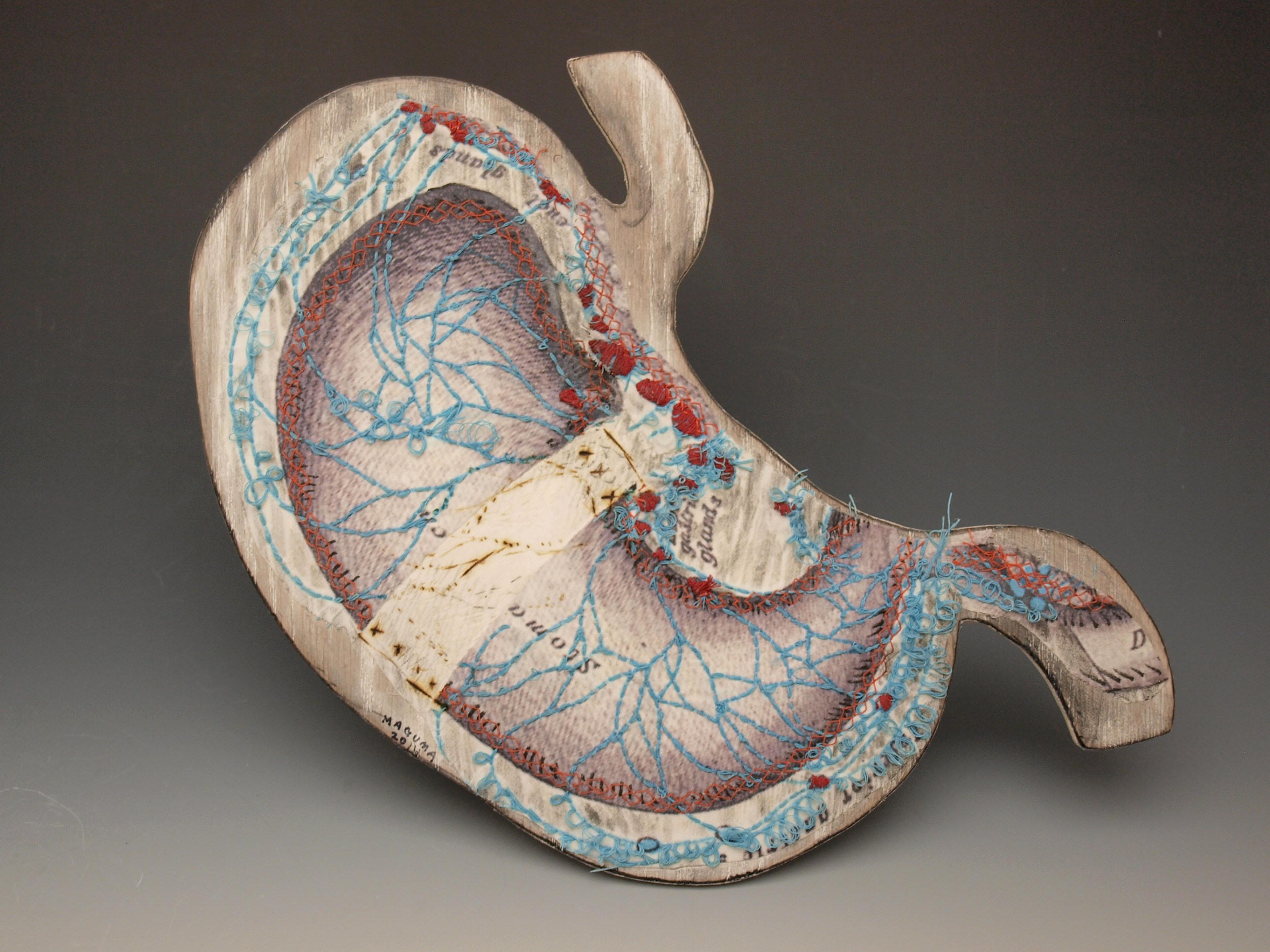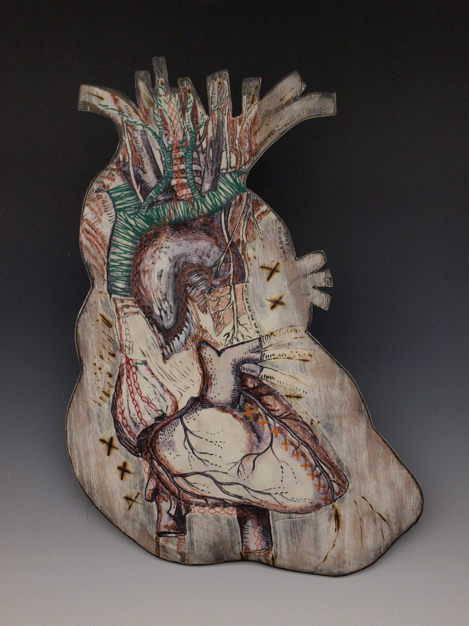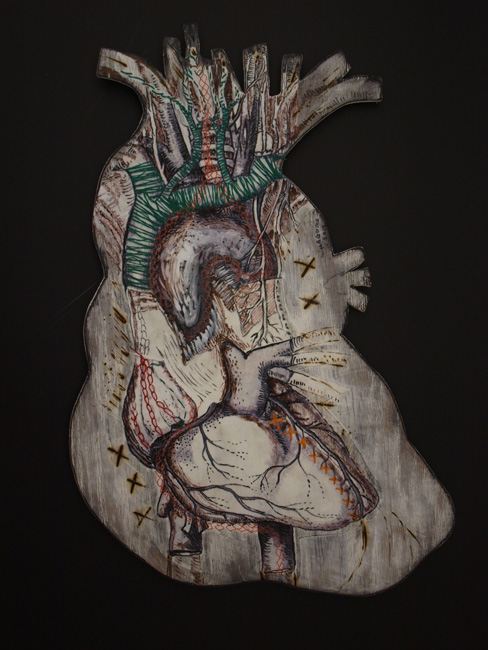 In this series I worked on wood cutouts with layers of embroidery, transfers and drawing on wooden cutouts of human organs. Each organ was created in relationship to deep emotional work during a year of introspection, healing and liberation.