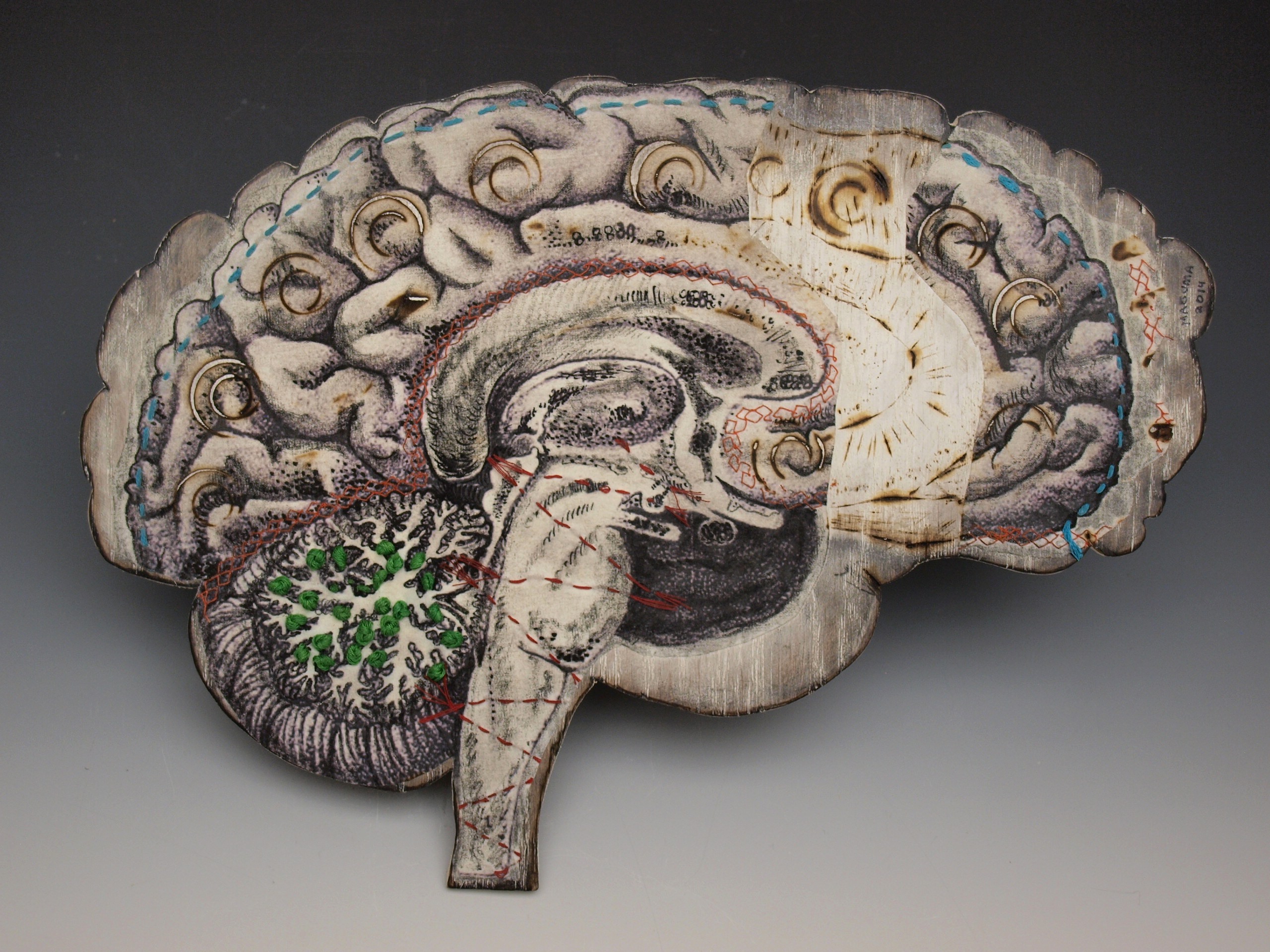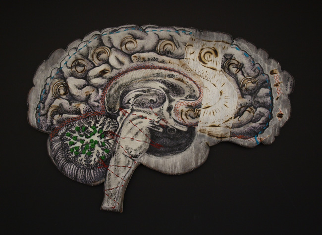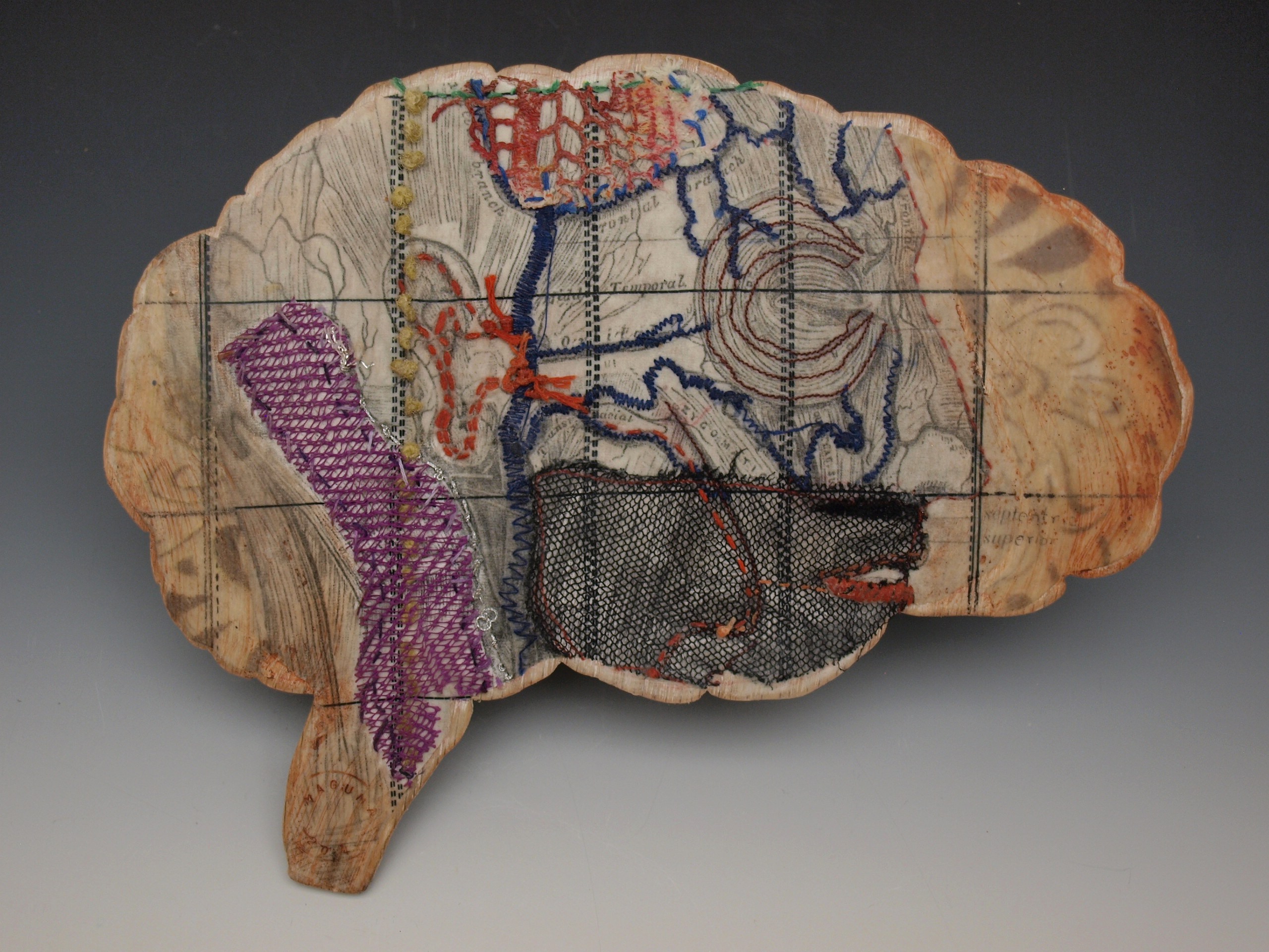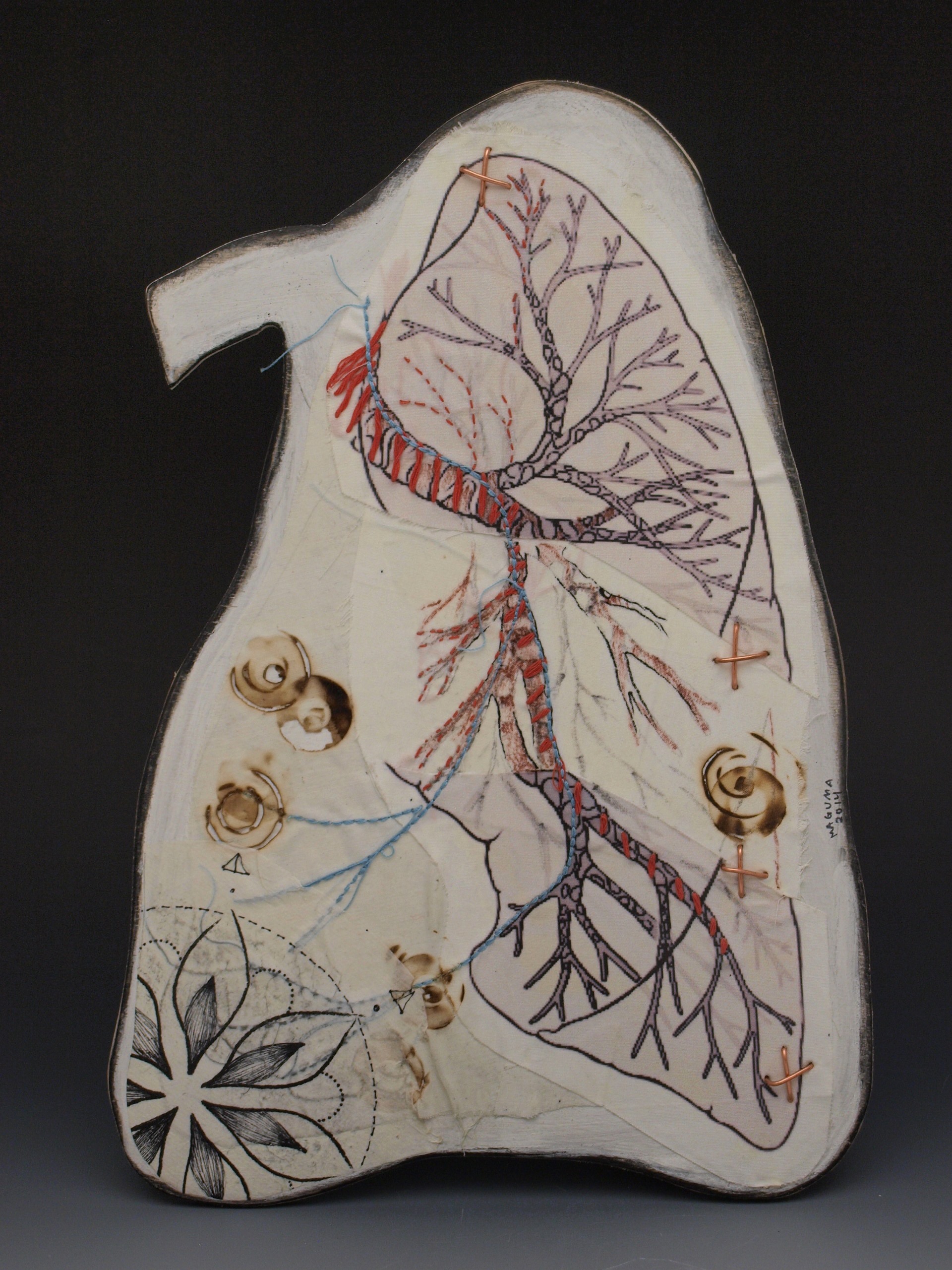In this series I worked on wood cutouts with layers of embroidery, transfers and drawing on wooden cutouts of human organs. Each organ was created in relationship to deep emotional work during a year of introspection, healing and liberation.