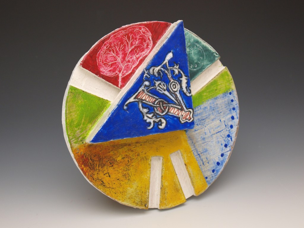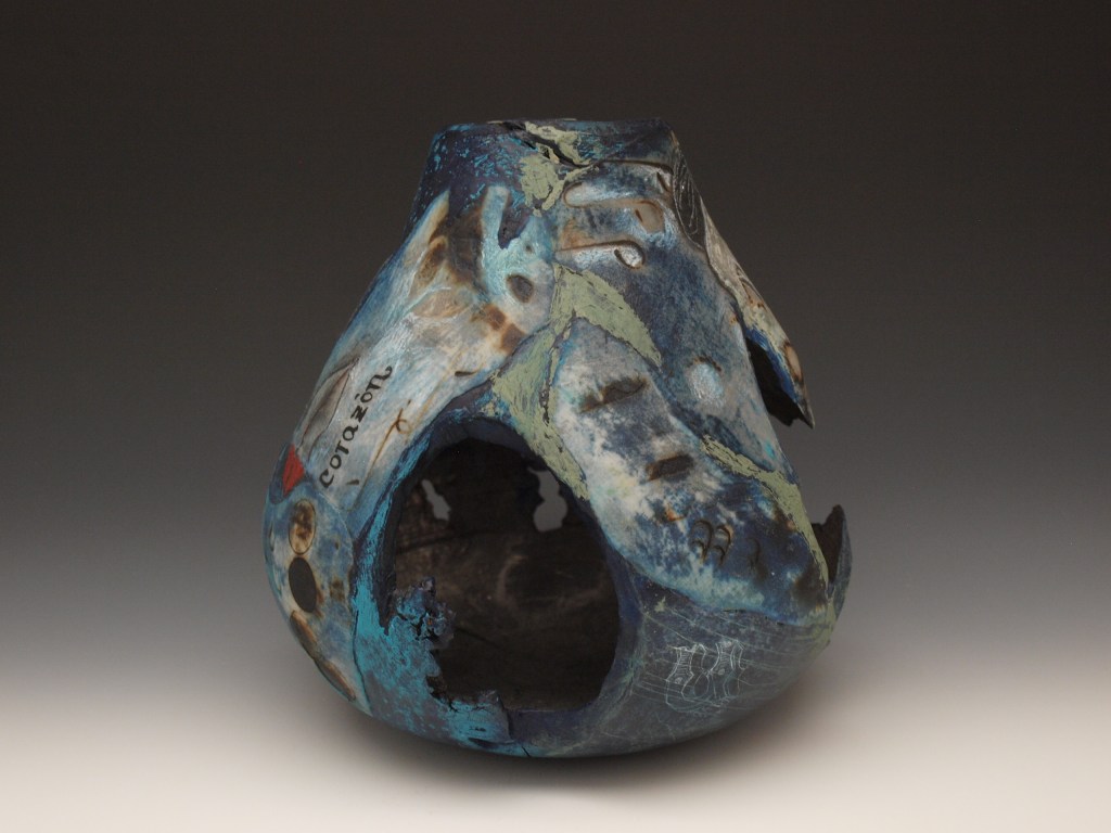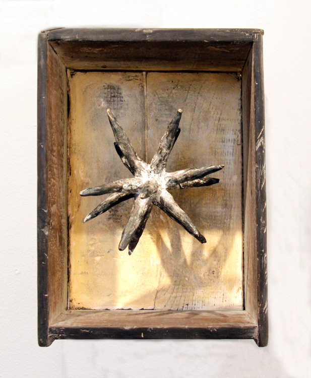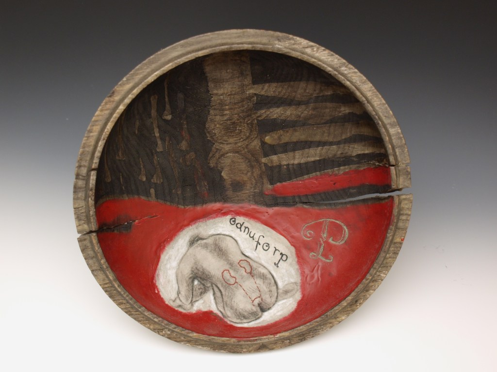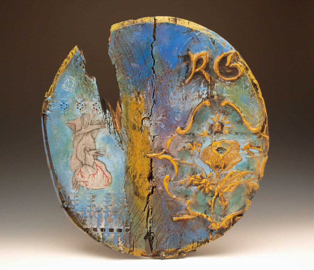This artwork has 27 pieces, one for each letter of the alphabet: Each letter in tandem elements of my healing process. The objects were made on repurposed wooden pieces carved on a leith, and layered with encaustics, embroidery and drawing. This series was exhibited in 2017 at The General Fine Craft Gallery, located in Almonte, Ontario.
