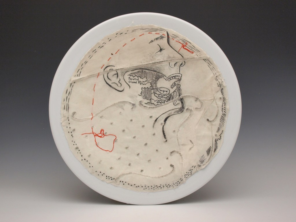 “Tongue”, ink, embroidery and cotton on porcelain, 2017