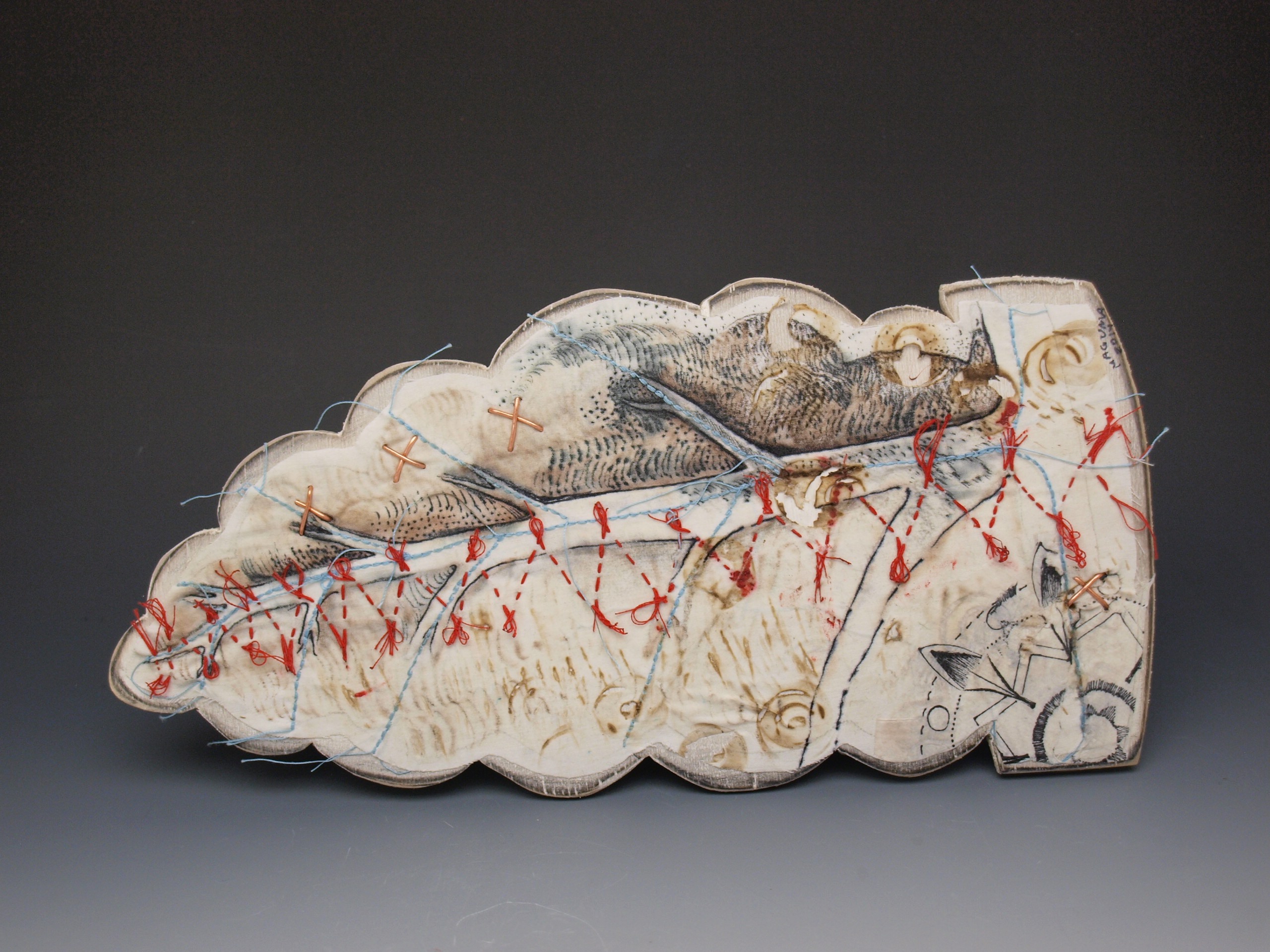 “Stomach”, ink, embroidery and cotton on porcelain, 2017